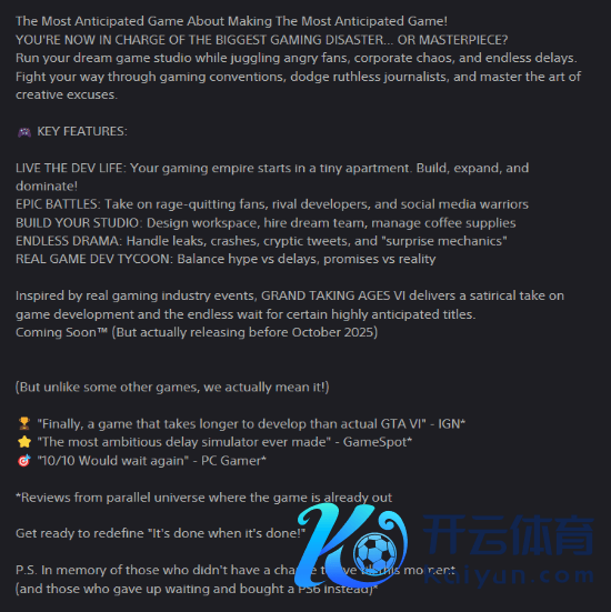咱们此前曾报谈,最近有一款名为《Grand Taking Ages VI》的游戏在PS商店上架,其简介也较为道理,写谈:“在这款游戏中,你将诡计梦思中的游戏职责室,同期濒临震怒的粉丝、公司杂乱和无限的展期。穿越游戏展会、规避冷凌弃记者,并掌执创造性借口的艺术!”