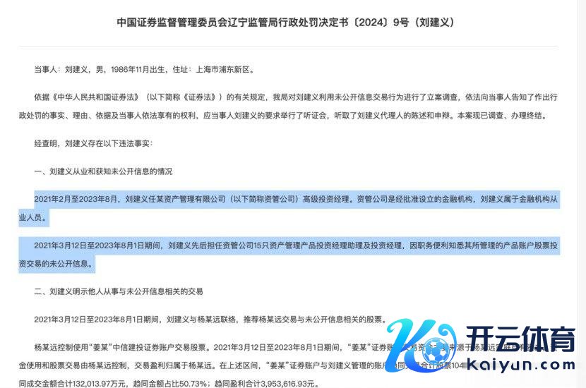 罚单露出,刘建义,男,1986年11月降生,住址:上海市浦东新区。2021年2月至2023年8月,任某资管公司高档投资司理。资管公司是经批准成就的金融机构,刘建义属于金融机构从业东谈主员。2021年3月12日至2023年8月1日历间,刘建义先后担任资管公司15只钞票惩处居品投资司理助理及投资司理,因职务便利明察其所惩处的居品账户股票投资来往的未公开信息。