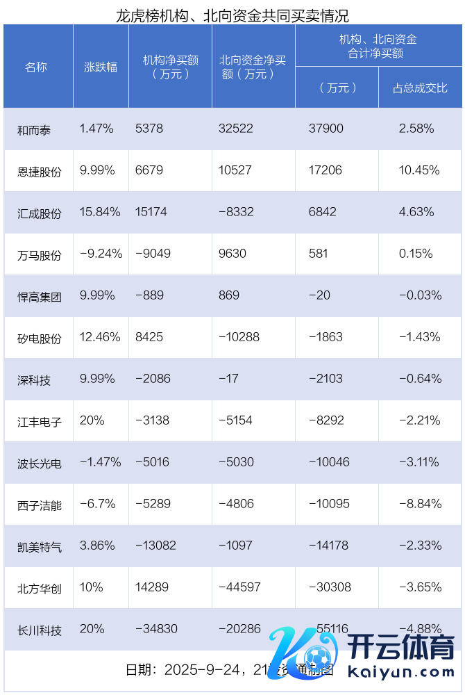 值得细心的是,机构和北向资金共同净买入了和而泰、恩捷股份等2股;共同净卖出了深科技、凯好意思特气、西子洁能、波长光电、江丰电子、长川科技等6股;在万马股份,悍高集团,汇成股份,矽电股份,朔方华创上出现不合,机构净卖出万马股份9048.88万元,北向资金净买入9630.28万元;机构净卖出悍高集团888.99万元,北向资金净买入868.91万元;机构净买入汇成股份1.52亿元,北向资金净卖出8331.92万元;机构净买入矽电股份8425.42万元,北向资金净卖出1.03亿元;机构净买入朔方华创1.43亿元,北向资金净卖出4.46亿元。