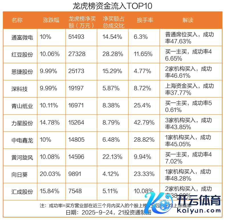 9月24日,上证指数飞腾0.83%,深证成指飞腾1.8%,创业板指飞腾2.28%。盘后龙虎榜数据显现,共有51只个股因当日异动登上龙虎榜,资金净流入最多的是通富微电(002156.SZ),达5.15亿元。