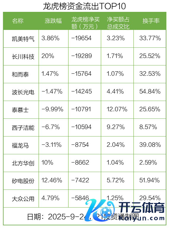 而龙虎榜中资金净流出最多的是凯好意思特气(002549.SZ),被净卖出为1.97亿元,占总成交金额的3.23%。凯好意思特气收盘飞腾3.86%,换手率为33.77%。