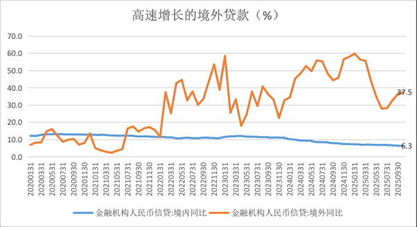 界面新闻记者 | 杨志锦 东说念主民币信贷商场呈现“冰火两重天”:境内需求疲软,境外需求却相配强劲。 央行近期更新的数据泄漏,为止10月末,金融机构境外东说念主民币贷款约2.5万亿元,比拟上年同期增长37.5%,高于金融机构境内东说念主民币贷款增速31个百分点。拉万古辰看,从2022年于今的四年时辰内,境外东说念主民币贷款增速真的齐保抓在20%以上,一度高达60%,而境内东说念主民币贷款增速则较低。 界面新闻记者凭据央行、同花顺ifind数据制图 这泄漏,东说念主民币信贷正在......【更多...】