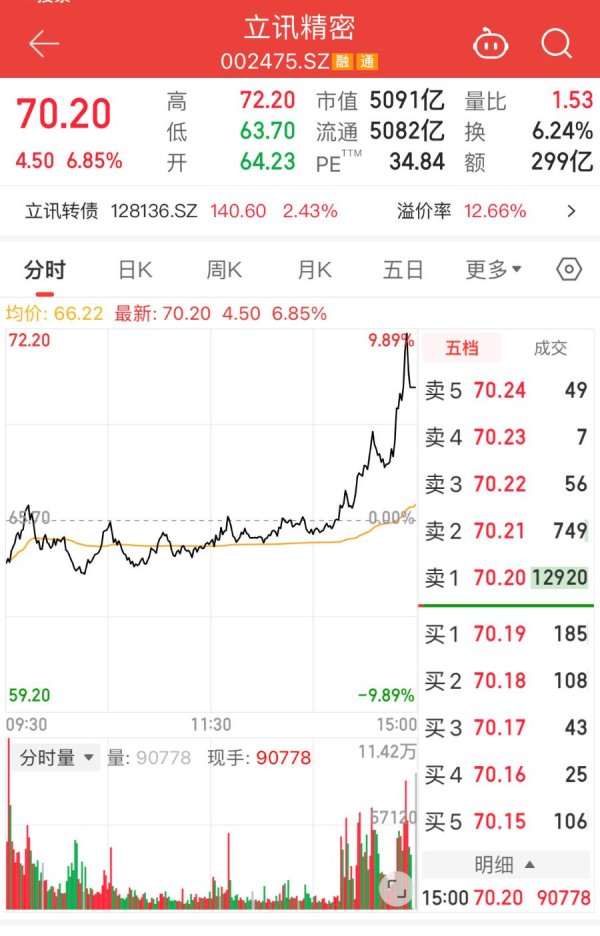 (原标题:奇瑞汽车上市带火“果链龙头”,立讯精密市值打破5千亿元) 9月24日,果链龙头立讯精密(002475.SZ)股价陆续强势推崇,尾盘快速拉升至72.29元/股,盘中涨幅达9.89%,再次刷新历史高点,收场收盘,立讯精密股价收涨6.85%,报70.2元/股,总市值打破5000亿元。自9月以来,立讯精密股价涨幅已超50%。 音信面上,立讯精密与奇瑞汽车的成本纽带成为阛阓焦点。9月25日,奇瑞汽车(09973.HK)将在港交所挂牌,以招股价上限30.75港元订价,刊行3亿股......【更多...】