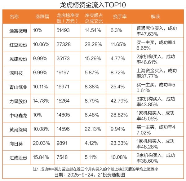 (原标题:5.15亿资金抢筹通富微电万博manbext网站登录,机构狂买汇成股份丨龙虎榜) 9月24日,上证指数飞腾0.83%,深证成指飞腾1.8%,创业板指飞腾2.28%。盘后龙虎榜数据显现,共有51只个股因当日异动登上龙虎榜,资金净流入最多的是通富微电(002156.SZ),达5.15亿元。 据21投资通智能监测,23只个股龙虎榜出现了机构的身影,北向资金参与龙虎榜中的个股共触及24只。 5.15亿资金抢筹通富微电,1.97亿资金出逃凯好意思特气 51只上榜的龙虎榜个股中......【更多...】